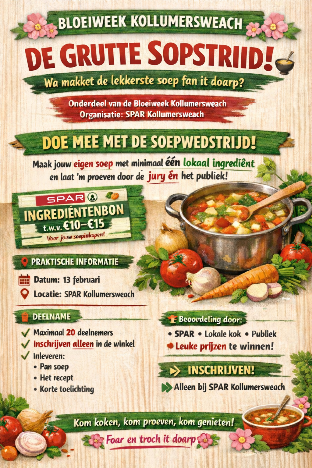 Doe mee aan De Grutte Sopstriid tijdens de Bloeiweek in Kollumersweach! Laat zien dat jij de lekkerste soep van het dorp kunt maken met minimaal één lokaal ingrediënt.