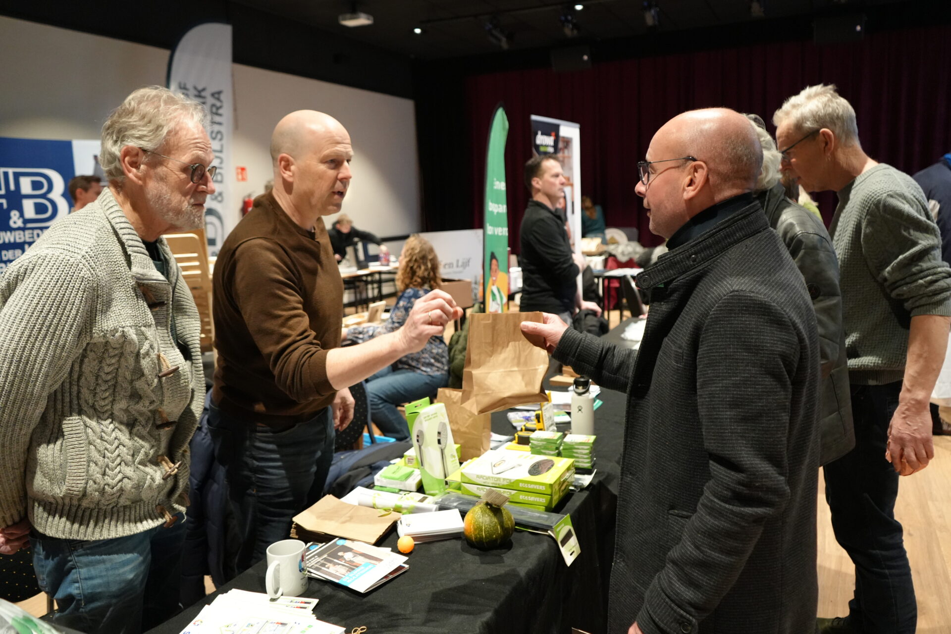 Energiecoöperatie Kleastersweach in actie op de Energie & Gezondheidsmarkt. Iedereen ging naar huis met een gratis prijs, bestaande uit een duurzame oplossing, of cadeaus aangeboden door stands in de zaal. Foto Studio Therèsa